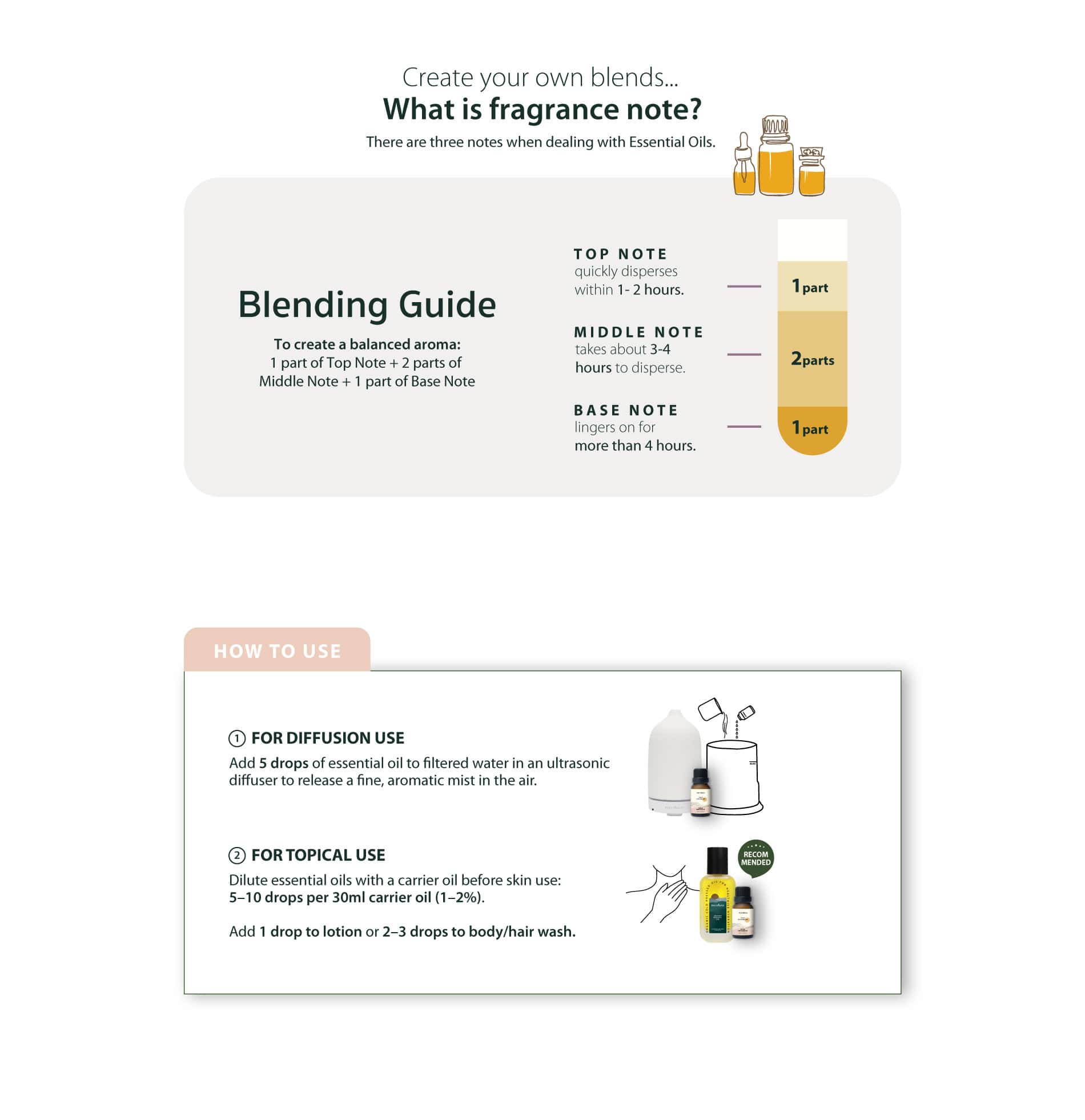 - For topical use, dilute essential oils with a carrier oil before applying to the skin. The standard dilution ratio is 1-2% (about 5-10 drops of essential oil per 30ml of carrier oil). Mix 1 drop into lotion or skincare products to improve skin condition, or add 2-3 drops to body and hair cleansers.